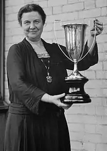 After completing her graduate work at Oxford University in 1894-1895, she returned to the U.S. where she taught 4 years in Boston at St. Margaret's and Miss Hersey's School for Girls. In 1899, she returned to Cleveland and began her long involvement with voluntary civic and women's organizations. Belle returned to Cleveland in 1900 and became the first President of the Consumers League of Ohio. During the first years of this century Sherwin was most active with the Visiting Nurse Association of Cleveland, serving on its board until 1924, and with the Cleveland Consumers' League, which she had organized in 1900.[1] In 1913 Sherwin was elected a trustee of Wellesley College, a position she served until 1943.[1] After World War I, Sherwin became the director of the Cleveland Welfare Federation. Next, she became the Vice President of the League of Women Voters from 1921–24 and became its President from 1924–34, the position which earned her much of her reputation as a dedicated suffragist leader.[3] The administrative, structural, and educational procedures established during this period were largely attributed to her leadership.[1] She was also on the board of the National Urban League, founded in 1918.[2] Sherwin died at home on July 5, 1955[3] and was interred at Lake View Cemetery, Cleveland, Ohio.