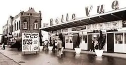 Licensed hotels were built at each of the three entrances to the gardens. The Longsight Hotel, built in 1851 and demolished in 1985, was a part of the entrance.[74] The Lake Hotel, built in 1876, had facilities for the free stabling of horses belonging to Belle Vue's visitors. It was extended in 1929 and then again in 1960, when a concert room was added, offering late-night entertainment. After its closure in the 1980s, the hotel was demolished.[71] The Hyde Road Hotel and Restaurant at the main entrance, originally known as Belle Vue House, was renamed the Palm Court Restaurant in 1942, and then Caesar's Palace in 1969. It housed a cabaret bar and a restaurant, which was converted to an amusement arcade in 1976 when it was once again renamed, to Jennison's Ale House. The building was closed after a partial collapse in 1980.[75]