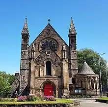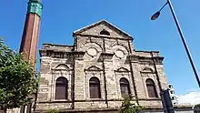 Designed by John Cooper and built in 1899, this former Coal Fired Power station highly unusually had an Italian Renaissance basilica style sandstone frontage.[18] The station originally powered the Leith Walk tram system and although it still houses an operational sub station, the building is in such poor repair, with the frontage now badly disintegrating, that it was put on the Buildings at Risk register in 2009, where it remains. The towering red brick chimney stack, however, is well preserved.