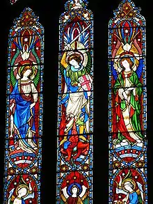 The church is noted for the quality of its sculpture and stained glass. There are windows depicting angels with harps, cymbals and pipes. There is an angel reredos in the east end of the church and a Victorian glass window showing the archangels Michael (the abbey's patron, sword and shield in hand, trampling the dragon), Raphael and Gabriel and the nine choirs of angels as an angelic orchestra sounding of praises of God.[7]
