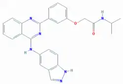 Belumosudil (formerly KD025 and SLx-2119) is an experimental drug being explored for the treatment of chronic graft versus host disease (cGvHD), idiopathic pulmonary fibrosis (IPF), and moderate to severe psoriasis. It is an inhibitor of Rho-associated coiled-coil kinase 2 (ROCK2; ROCK-II).[1] Belumosudil binds to and inhibits the serine/threonine kinase activity of ROCK2. This inhibits ROCK2-mediated signaling pathways which play major roles in pro- and anti-inflammatory immune cell responses. A genomic study in human primary cells demonstrated that the drug also has effects on oxidative phosphorylation, WNT signaling, angiogenesis, and KRAS signaling.[2] Originally developed by Surface Logix, Inc,[1] Belumosudil was later acquired by Kadmon Corporation. As of July 2020 the drug was in completed or ongoing Phase II clinical studies for cGvHD, IPF and psoriasis.[3]
