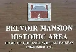 Belvoir was the agricultural forced labor camp and estate of colonial Virginia's prominent William Fairfax family. Built with the forced labor of enslaved people, it sat on the west bank of the Potomac River in Fairfax County, Virginia, at the present site of Fort Belvoir. The main house — called Belvoir Manor or Belvoir Mansion — burned in 1783 and was destroyed during the War of 1812. The site has been listed on the National Register of Historic Places since 1973 [1] as "Belvoir Mansion Ruins and the Fairfax Grave."