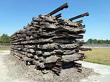 There was a hand-painted sign on the new building that read Stiftung Hackenholt or Hackenholt Foundation named after the SS man who designed it.[29] Until December 1942 at least 350,000 to 400,000 Jews were murdered in the new gas chambers.[10] One Wehrmacht sergeant at the train station in Rzeszow, Wilhelm Cornides, recorded in his diary a conversation with a German policeman on 30 August 1942. The Bahnschutzpolizei told him: "trains filled with Jews pass almost daily through the railway yards and leave immediately on the way to the camp. They return swept clean most often the same evening."[30] The last transport of Jews arrived at Bełżec on 11 December 1942.[10] The buried remains often swelled in the heat as a result of putrefaction and the escape of gases. The surface layer of soil split. In October 1942 the exhumation and burning of all corpses was ordered to cover up the crime on direct orders from SS-Obergruppenführer Odilo Globocnik, the deputy of Reichsführer-SS Heinrich Himmler in Berlin. The bodies were placed on pyres made from rail tracks, splashed with petrol and burned over wood. The bones were collected and crushed. The last period of camp's operation continued until June 1943 when the area was ploughed over, and disguised as a farm.[3]