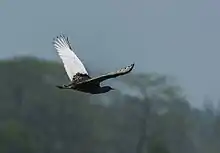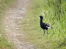 Adult Bengal floricans range from 66–68 cm (26–27 in) in length and stand around 55 cm (22 in) tall.[2] The male has black plumage from the head and neck to underparts. Its head carries a long lanky crest, and the neck has elongated display plumes. The upperside is buff with fine black vermiculations and black arrowhead markings, and there is a conspicuous large white patch from the wing coverts to the remiges. In flight, the male's wings appear entirely white except for the dark primary remiges. The feet and legs are yellow, the bill and irides are dark.[3]