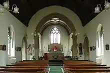 The church was built in 1914 by Arthur Young in the Gothic style and is Grade II listed[2] as a building of special architectural or historic interest. It was opened in January 1915. The Lady chapel was added in 1916 and the porch in 1934. The 45-foot tall tower, surmounted by a 35-foot copper spire was added in 1939. The church was consecrated in 1940[3] by the auxiliary bishop of Westminster, Edward Myers.