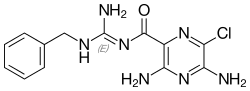 Benzamil or benzyl amiloride is a potent blocker of the ENaC channel[1] and also a sodium-calcium exchange blocker.[2][3] It is a potent analog of amiloride, and is marketed as the hydrochloride salt (benzamil hydrochloride). As amiloride, benzamil has been studied as a possible treatment for cystic fibrosis,[4] although with disappointing results.[5]