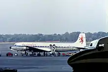 1960 was also the year Pan Am withdrew its last DC-4 from Tempelhof. As a result, all of the airline's Berlin routes were exclusively served with DC-6Bs as of 27 June of that year.[46] Although the DC-6B was a less advanced aircraft than either the Viscount or the Caravelle, it was more economical. By the early 1960s, Pan Am had a fleet of 15 DC-6Bs stationed at its Tempelhof base,[53][54] which were configured in a higher-density seating arrangement than competing airlines' aircraft. (Pan Am's DC-6Bs were originally configured in a 76-seat, all-economy layout. The subsequent introduction of subsidies for all scheduled internal German services from/to West Berlin resulted in steady network growth as well as service frequency and passenger load increases. To cope with the sharply higher traffic volumes, aircraft seat densities were increased twice – initially to 84 and subsequently 87 seats.[29]) This fleet eventually grew to 17 aircraft, which gave Pan Am the biggest aircraft fleet among the three main scheduled operators flying from West Berlin. It furthermore enabled it to compensate for the DC-6's lack of sophistication with higher frequencies than its competitors, thereby attaining a higher market share (60%) and capturing a greater share of the lucrative business travel market than its rivals. During that period, Pan Am moreover achieved an ultra short-haul load factor of 70% on its eight scheduled internal routes from Berlin, making the airline's Berlin routes the most profitable in its worldwide scheduled network.[33][55][56][57]