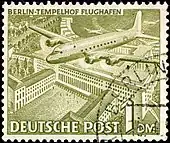 American Overseas Airlines (AOA), at the time the overseas division of American Airlines, inaugurated the first commercial air link serving Tempelhof after the war with a flight from New York via Shannon, Amsterdam and Frankfurt on 18 May 1946.[27][28] This was followed by AOA's inauguration of West Berlin's first dedicated domestic air link between Tempelhof and Frankfurt's Rhein-Main Airport on 1 March 1948.[29]