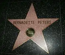 Peters has received many honorary awards, including a star on the Hollywood Walk of Fame in 1987.[172] She was named the Hasty Pudding Woman of the Year in 1987.[173] Other honors include the Sarah Siddons Award for outstanding performance in a Chicago theatrical production (1994 for The Goodbye Girl);[174] the American Theatre Hall of Fame at the Gershwin Theatre in New York City (1996), as the youngest person so honored;[175] The Actors' Fund Artistic Achievement Medal (1999);[176] an Honorary Doctorate from Hofstra University (2002);[177] the Hollywood Bowl Hall of Fame in 2002[178] and the National Dance Institute 2009 Artistic Honoree.[179] She was the recipient of the Sondheim Award, presented by the Signature Theatre in 2011.[180]