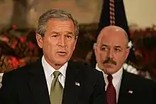 After the 2003 invasion of Iraq, President George W. Bush appointed Kerik as the interior minister of the Iraqi Coalition Provisional Authority. In 2004, Bush nominated Kerik to lead the Department of Homeland Security. However, Kerik soon withdrew his candidacy, explaining that he had employed an undocumented immigrant as a nanny. His admission touched off state and federal investigations. In 2006, Kerik pleaded guilty in Bronx Supreme Court to two unrelated misdemeanor ethics violations and was ordered to pay $221,000 in fines. In 2009, Kerik pleaded guilty in the Southern District of New York to eight federal felony charges, and in February 2010, he was sentenced to four years in federal prison.[3][4] On February 18, 2020, President Donald Trump granted Kerik a full pardon.[5] On November 7, 2020, Kerik stood behind Trump's personal lawyer, Rudy Giuliani, during the Four Seasons Total Landscaping press conference in Philadelphia, Pennsylvania.[6]