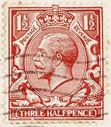 In 1910 Mackennal designed the Coronation Medal for King George V and also won the important commission for the obverse design (the monarch's head) of the new coinage needed for the new reign from 1911, from which he developed the new design for the King's head on British postage stamps.[1] This is certainly his most enduring design. His initials, B.M., can be seen on the truncation of the King's neck on the obverse of all British coins of George V. His next important work was the memorial to Thomas Gainsborough at Sudbury, which was followed by the memorial tomb of King Edward VII at St. George's Chapel, Windsor. Mackennal also sculpted statues of King Edward VII for London, Melbourne, Calcutta and Adelaide.