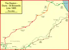 The Duns Branch and the Berwickshire Railway together formed a through railway route from Reston, near Berwick-upon-Tweed, to St Boswells in the Scottish Borders. The line was promoted in two stages. The first was from Reston on the Edinburgh to Berwick main line to Duns (then spelt Dunse, and the county town of Berwickshire); it opened by the North British Railway in 1849.