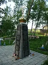 ![]() From top left clockwise: the building of school No. 1 in 2008, the Orthodox cross in the gymnasium in memory of the victims, the "Tree of sorrow" memorial cemetery, photos of the victims. | |
