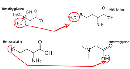 - Trimethylglycine (methyl donor) + homocysteine (hydrogen donor) → dimethylglycine (hydrogen receiver) + methionine (methyl receiver)