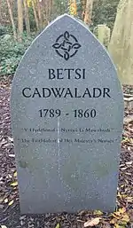 Conditions in the Crimea eventually took their toll on Cadwaladr's health, as she was ill with cholera and dysentery when she returned to Britain in 1855, a year before the war ended. She lived in London, again at her sister's house, during which time she wrote her autobiography.[1] She died in 1860, five years after her return, and was buried in the pauper's section of Abney Park Cemetery in north London.[5] A new memorial stone was placed on her grave in August 2012.[2]