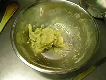 Beurre manié (French "kneaded butter") is a dough, consisting of equal parts by volume of soft butter and flour, used to thicken soups and sauces. By kneading the flour and butter together, the flour particles are coated in butter. When the beurre manié is whisked into a hot or warm liquid, the butter melts, releasing the flour particles without creating lumps.[1]