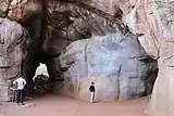Of the numerous shelters, the Auditorium cave is one of the significant features of the site. Surrounded by quartzite towers which are visible from several kilometres' distance, the Auditorium rock is the largest shelter at Bhimbetka. Robert Bednarik describes the prehistoric Auditorium cave as one with a "cathedral-like" atmosphere, with "its Gothic arches and soaring spaces".[26] Its plan resembles a "right-angled cross" with four of its branches aligned to the four cardinal directions. The main entrance points to the east. At the end of this eastern passage, at the cave's entrance, is a boulder with a near-vertical panel that is distinctive, one visible from distance and all directions. In archaeology literature, this boulder has been dubbed as "Chief's Rock" or "King's Rock", though there is no evidence of any rituals or its role as such.[26][27][28] The boulder with the Auditorium cave is the central feature of the Bhimbetka, midst its 754 numbered shelters spread over few kilometres on either side, and nearly 500 locations where rock paintings can be found, states Bednarik.[26]