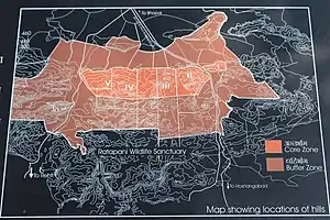 The Rock Shelters of Bhimbetka is 45 kilometres south-east of Bhopal and 9 km from Obedullaganj city in the Raisen District of Madhya Pradesh at the southern edge of the Vindhya hills. South of these rock shelters are successive ranges of the Satpura hills. It is inside the Ratapani Wildlife Sanctuary, embedded in sandstone rocks, in the foothills of the Vindhya Range.[8][18] The site consists of seven hills: Vinayaka, Bhonrawali, Bhimbetka, Lakha Juar (east and west), Jhondra and Muni Babaki Pahari.[1]