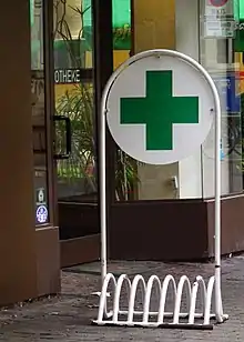 | Grid style | Ladder | The grid consists of vertical bars that connect larger upper and lower metal tubing that accept bikes on one or both sides of the rack. Grid style racks can be left freestanding or anchored to the ground with permanent or temporary anchors. This rack does not allow both the wheel and frame of the bike to be locked, allowing for potential theft of the bicycle.[12] | ![]() Free-standing ladder rack in front of an apothecary in Baden-Württemberg, Germany |
