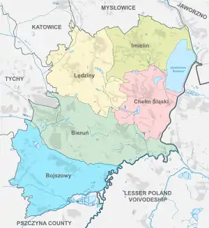 Bieruń-Lędziny County is bordered by the cities of Mysłowice and Jaworzno to the north, Oświęcim County to the east, Pszczyna County to the south, and the cities of Tychy and Katowice to the west.