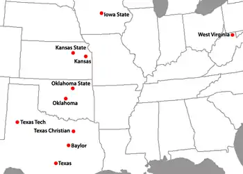 | Baylor | Iowa State | Kansas | Kansas State | Oklahoma | Oklahoma State | TCU | Texas | Texas Tech | West Virginia | |