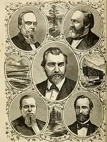 "The Big Four" was the name popularly given to the famous and influential businessmen, philanthropists and railroad tycoons who funded the Central Pacific Railroad, (C.P.R.R.), which formed the western portion through the Sierra Nevada and the Rocky Mountains of the First Transcontinental Railroad in the United States, built from the mid-continent at the Mississippi River to the Pacific Ocean during the middle and late 1860s.[1] Composed of Leland Stanford, (1824–1893), Collis Potter Huntington, (1821–1900), Mark Hopkins (1813–1878), and Charles Crocker, (1822–1888), the four themselves, however, personally preferred to be known as "The Associates."[2]
