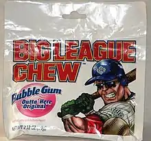 Big League Chew is a brand of bubble gum that is shredded and packaged in an aluminum foil pouch. It was created by Portland Mavericks left-handed pitcher Rob Nelson and bat boy Todd Field[1] then pitched to the Wrigley Company (longtime owners of the Chicago Cubs) by fellow Maverick and former New York Yankee All-Star Jim Bouton as a fun imitation of the tobacco-chewing habit common among ballplayers in the 1970s. Over 800 million pouches of Big League Chew have been sold since 1980.[2][3] Big League Chew was introduced in May 1980, in the traditional pink color already seen in established brands of bubble gum. The cartoony packaging, originally designed by artist Bill Mayer, comes in flashy colors such as neon green (for their sour apple flavor) and bright purple (grape flavor). The original shredded R&D concept samples of the product were actually produced by running standard sheets of bubble gum through a standard office paper shredder.