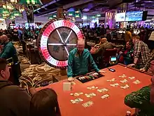 The wheel is divided into a number of equal segments separated by spokes or pins. Each segment is associated with a number. The wheel is spun by a dealer, and the winning segment is indicated by a pointer mounted on a flexible piece of rubber or leather, which also rubs against the pins to impart friction and slow the wheel down. Should the player stop the wheel, the segment at the top is the winner.