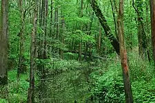 On a larger scale of ecoregions of the United States, the Big Thicket is part of the Piney Woods.[22] The Big Thicket is located in the southwest of the Piney Woods and transitions into the Western Gulf coastal grasslands[23] immediately to the south. To the west are the Texas Blackland Prairies and East Central Texas forests[24] (a.k.a. post-oak savanna). Within the Big Thicket, a major component in the high diversity of plants and animals is the variety of ecosystems present in a relatively small area. The National Park Service identifies eight plant communities in Big Thicket National Preserve.[25] Some biologist and plant ecologists identify as many as nine, ten, or eleven ecosystems in the Big Thicket.[4][5][11] In nature these ecosystems are not always found in pure, large tracts of land, and often occur in intertwined and checkerboard mixes and ecotones, transitioning into one another. Ecosystems do not have universal standardized names. Many ecologist, botanist, zoologist and others have studied and classified ecosystems in the Big Thicket region (and elsewhere), defining and naming these communities as relevant to their own disciplines and studies.[26][4] Although the exact names, definitions, and boundaries might vary (subdivided, compounded, or overlapping), below are summaries of ten major ecosystems recognized by most who have studied and written about the Big Thicket, starting with higher elevations in the north, and in a generalized way, moving to lower elevations in the south.