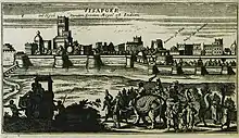 The city consists of three distinct portions: the citadel, the fort and the remains of the city. The citadel, built by the Adilshahi Sultans, a mile in circuit, is of great strength, well built of the most massive materials, and encompassed by a ditch 100 yards (91 m) wide, formerly supplied with water. The fort, which was completed by the Adilshahi Sultans in 1566, is surrounded by a wall 6 m. in circumference. This wall is from 30 to 50 ft (15 m) high, and is strengthened with ninety-six massive bastions of various designs. In addition there are ten others at the various gateways. The width is about 25 ft (7.6 m); from bastion to bastion runs a battlement curtained wall about 10 ft (3.0 m) high. The whole is surrounded by a deep moat 30 to 40 ft (12 m) broad. Inside these walls the Bijapur kings bade defiance to all comers. Outside the walls are the remains of a vast city, now for the most part in ruins, but the innumerable tombs, mosques, which have resisted the havoc of time, afford abundant evidence of the ancient splendor of the place. Badami, Aihole, and Pattadakal, near Bijapur, are noted for their historical temples in the Chalukya architectural style.