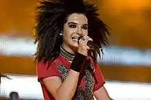 German site dw-world.com says that Kaulitz's look, young age and edgy hairstyle has helped him obtain icon status among many teenage girls.[19] Der Spiegel reports that Kaulitz is an icon within the LGBT community, which Kaulitz has embraced.[15] Kaulitz designs many of his own stage costumes, and despite poor drawing skills, the designs are constructed by his tailor.[20] The singer apparently collects suspenders, and is also "totally crazy about jackets". Kaulitz reports he has hundreds of jackets in his closet – though he has said that none of his jackets are real leather as he is opposed to using animal pelts/feathers for clothing.[20] He cites his fashion and style influences as David Bowie (particularly in the 1986 film Labyrinth), Nena, Vampires, Paris' secondhand shops, striking jewelry and Dior Homme.[20] He also cites Steven Tyler, Karl Lagerfeld and Hedi Slimane.