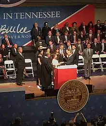 Lee was sworn in on January 19, 2019.[2] He issued five executive orders in his first two months in office; one addressed economically distressed rural counties in Tennessee, another addressed nondiscrimination in employment, and a third imposed a 90-day "freeze" on the issuance of new regulations by executive departments.[18] Lee announced that the governor's website would include a new feature to allow citizens to give feedback on bills that had passed through the General Assembly and were awaiting his signature or veto.[19]