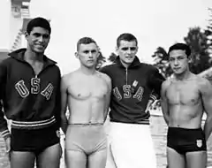 ![]() Gold medal winning U.S. team of 4 × 200 meters free relay in Helsinki 1952: William Woolsey (at left), Wayne Moore, James McLane and Ford Konno. | |||||||||||||||||||||||