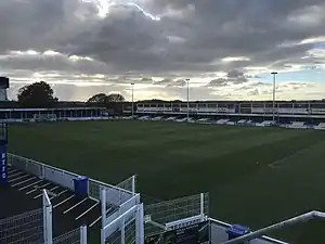 In 1980 a permanent 120-seat stand was built between the Cowshed and the clubhouse; its shape led to it becoming known as the Pacman stand.[10][11] During the 1980s a 200-seat stand was built on the side that had previously hosted the temporary seating, with the supporters club erecting several small areas of terracing.[10] In 1995 Billericay bought two stands that had been in use at Newbury Town's Faraday Road ground after the club went bust. One was installed next to the Cowshed and the other at the Blunts Wall End, with seats later installed in the Blunts Wall End stand.[10] The new stand adjacent to the Cowshed was soon moved to the other end of the pitch.[10] An area of covered terracing was added alongside the 200-seat stand.[11] Chelmsford City groundshared at New Lodge between 1998 and 2005.[14] In 2002 the club announced plans to move to a new 4,000-capacity stadium at Gloucester Park. However, the relocation was scrapped by new chairman Steve Kent in 2004.[15] By the summer of 2017 the ground had a capacity of 3,500, of which 424 was seated and 2,000 was covered.[13]