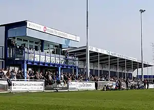 Archer Hall became the club's permanent home ground during the 1930s, although it remained an unenclosed pitch.[10] In 1970 the club moved to New Lodge, which had previously been a sports ground used by Outwell Common Football Club.[11] The ground was enclosed using a loan from Basildon Borough Council and Charrington Brewery and dressing rooms and a clubhouse were built.[10] During the 1970s a covered standing area was built on the clubhouse side of the pitch, which became known as the Cowshed.[10] Temporary seated stands loaned from Essex County Cricket Club were later installed on the other side of the pitch.[10] In 1977 the club won a set of floodlights by winning the Philips Electrical Floodlight Competition final against Friar Lane Old Boys,[12] a six-a-side tournament played at the Crystal Palace National Sports Centre the day after their FA Vase final against Sheffield.[3] The floodlights were inaugurated with a friendly match against West Ham United, which attracted a then-record crowd of 3,841.[13]