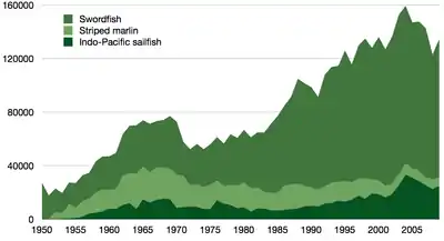 Billfish are exploited both as food and as fish. Marlin and sailfish are eaten in many parts of the world, and many sport fisheries target these species. Swordfish are subject to particularly intense fisheries pressures, and although their survival is not threatened worldwide, they are now comparatively rare in many places where once they were abundant. The istiophorid billfishes (marlin and spearfish) also suffer from intense fishing pressures. High mortality levels occur when they are caught incidentally by longline fisheries targeting other fish.[56] Overfishing continues to "push these declines further in some species".[57] Because of these concerns about declining populations, sport fishermen and conservationists now work together to gather information on billfish stocks and implement programs such as catch and release, where fish are returned to the sea after they have been caught. However, the process of catching them can leave them too traumatised to recover.[38] Studies have shown that circle fishing hooks do much less damage to billfish than the traditional J-hooks, yet they are at just as effective for catching billfish. This is good for conservation, since it improves survival rates after release.[58][59]