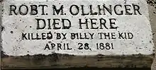 In 1940, stone cutter James N. Warner of Salida, Colorado, made and donated to the cemetery a new marker for Bonney's grave.[142] It was stolen on February 8, 1981, but recovered days later in Huntington Beach, California. New Mexico Governor Bruce King arranged for the county sheriff to fly to California to return it to Fort Sumner,[143] where it was reinstalled in May 1981. Although both markers are behind iron fencing, a group of vandals entered the enclosure at night in June 2012 and tipped the stone over.[144]