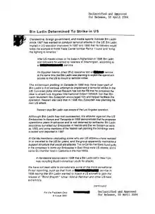 Bin Ladin Determined To Strike in US was the title of the President's Daily Brief prepared by the Central Intelligence Agency and given to U.S. President George W. Bush on Monday, August 6, 2001. The brief warned, 36 days before the September 11 attacks, of terrorism threats from Osama bin Laden and al-Qaeda, including "patterns of suspicious activity in this country consistent with preparations for a hijacking" of U.S. aircraft.[1]