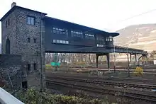 The Bingerbrück Kreuzbach (Bkb) signal box is located to the north of Bingen Hbf near the former southern hump of the marshalling yard. It is a gantry signal box, which increased the available room for operations by extending over the railway facilities. This signal box was designed by the architect Hans Kleinschmidt as a steel skeleton and was designed and completed in 1936. The western end of the building is built of broken stone. The actual signal tower is 15 metres long and in addition it has operating rooms and a pedestrian bridge. The interlocking system, which it housed, was a 10-metre-long electro-mechanical interlocking system of class E 43 made by the Siemens company. At its peak, the signal box was staffed by five people who were particularly responsible for the marshalling and operation of trains at the freight yard. In 1996, after 60 years of operations, the signal box, together with the other signal boxes, was removed from service and replaced by the central interlocking Bf on the Nahe bridge. The gantry signal box was listed as a historic landmark on 8 November 2005.[10] In addition, it is now one of the cultural monuments listed in the UNESCO World Heritage Site of the Upper Middle Rhine Valley.[11] After an inspection of the bridge carried out in 2006 found structural defects, access to the bridge was blocked. In April 2009, Bingen town council requested that the federal and state governments allocate funds for the preservation of the World Heritage Site towards the restoration of the signal box.