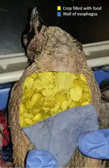 The neck of a bird is composed of 13–25 cervical vertebrae enabling birds to have increased flexibility.[7] A flexible neck allows many birds with immobile eyes to move their head more productively and center their sight on objects that are close or far in distance.[8] Most birds have about three times as many neck vertebrae as humans, which allows for increased stability during fast movements such as flying, landing, and taking-off.[9] The neck plays a role in head-bobbing which is present in at least 8 out of 27 orders of birds, including Columbiformes, Galliformes, and Gruiformes.[10] Head-bobbing is an optokinetic response which stabilizes a birds surroundings as they alternate between a thrust phase and a hold phase.[11] Head-bobbing is synchronous with the feet as the head moves in accordance with the rest of the body.[11] Data from various studies suggest that the main reason for head-bobbing in some birds is for the stabilization of their surroundings, although it is uncertain why some but not all bird orders show head-bob.[12]