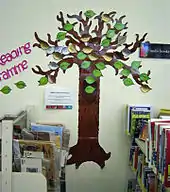 Children's programmes were in place from early on. Eleanor Fisher persuaded local residents to come in and read to youngsters during school holidays. Storytime went for an hour once a week, and up to 50 youngsters attended.[133] Class visits by local schools started in 1954, and became a regular feature.[134][135] Outside of this collaboration with schools the library offered reading programmes, such as "Go Bush" and later, as part of the North Shore Libraries, the Rakaau Reader scheme. This encouraged reading by setting targets coupled with incentives and visible marks of achievement, such as green, silver, then gold leaves on the Raakau tree (pictured).[136][137]