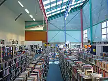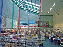 In 2005, in preparation for building works on the same site, the library was shifted to a converted basketball court in the Birkenhead Leisure Centre in Mahara Avenue (pictured). Other alternative sites had been considered, but most were found to be either inappropriate or too expensive.[38] With limited space available for services, the Plunket, Citizen's Advice Bureau (CAB), and council Area Office had to find alternative premises.[39][40] In fact only 50% to 60% of the library's own stock could be accommodated.[38]