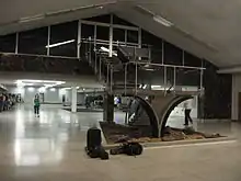 Continued growth in passenger traffic by 1962 resulted in the construction of a second passenger terminal and a new air traffic control tower,[10] built west of the original 1931 terminal. This was dedicated on February 11, 1962 as the Birmingham Air Terminal. Charles H. McCauley Associates was the supervising architect and Radar & Associates was the designing architect.[17] It consisted of a single story building of repeated bays with steeply pitched roofs, which flanked a wider, higher center bay at the south end of the building for ticketing. A long, flat roofed northern section comprised the ground-level aircraft gates.[12][18] The air traffic control tower, completed in 1962 and located immediately southwest of the terminal, was 87 feet (27 m) tall. The 1962 control tower was demolished in 2004 after being replaced by the 2001 air traffic control tower.[19] This terminal was demolished to make way for the 2011 terminal expansion; the 1962 terminal being located in the area now covered by the aircraft apron for Gate A1.