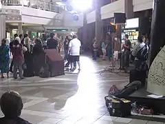 Several pieces of artwork are displayed within the terminal and on the airport grounds. Approaching the airport along Messer Airport Boulevard, travelers pass a series of white three dimensional triangular shapes placed on raised posts along the shoulder and median of the roadway with a mid-span folded crease to suggest the wings of birds in flight or aircraft. In the 1990s terminal there were multiple pieces of art that became well known to frequent visitors to the airport. However, with the terminal modernisation project, most of these pieces were replaced with new, more modern, and in some cases, technologically advanced works. There are two unique major artwork displays in the terminal, both of which are in Concourse B. The first major display is a living plant wall entitled "Earth Wind and Water: The Landscape of Alabama". This living wall is the largest living wall inside any airport terminal in the United States. The wall is 100 feet wide, 14 feet high, and contains 1,400 square feet of vegetated area. The second major work of art is an electronic display which is approximately 50 feet long and made up of 26 large format electronic LCD displays. The displays contain pictures and video clips which are linked to form an ever-changing moving wall depicting various "stories" focussing on African American history and civil rights.[44] There is also an art program at the airport which puts on display revolving collections of works throughout the terminal. The program includes works from local artists as well as artists from around the country.[44] In addition there is a rotating Barber Motorsports exhibit on the lower level near the baggage claim. This exhibit features frequently changing displays containing various automobiles and race memorabilia such as driving suits and mounted steering wheels from famous race cars. There are many smaller works of art throughout the terminal, both pre and post-security. The airport website has an updated list of the various works of art on display.[45]