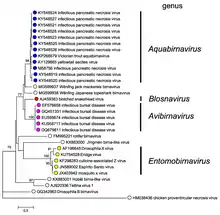 Birnaviridae is a family of double-stranded RNA viruses.[1] Salmonid fish, birds and insects serve as natural hosts. There are currently 11 species in this family, divided among seven genera.[2] Diseases associated with this family include infectious pancreatic necrosis in salmonid fish, which causes significant losses to the aquaculture industry, with chronic infection in adult salmonid fish and acute viral disease in young salmonid fish.[2][3]