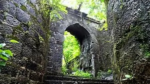 There are four corner bastions and the main gate in good condition. There are many stone cut water cisterns on the fort. Two cannons are now moved to the temple at the base of the fort. The view from the summit is pleasing with rice-fields and dense pockets of the jungle around.