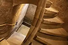 A spiral staircase leads down to the vault, built in Renaissance style, that dates to the last quarter of the sixteenth century.[2] The staircase has been completely renovated.[4] It is about 7.5 metres (25 ft) in height, with a cloakroom halfway down about 7 square metres (75 sq ft) in area. There are niches in the wall to hold candles or oil lamps. The bath itself is dug into alluvial ground over 8.5 metres (28 ft) below ground level, fed by groundwater. Heavy rains and periods of high water provide clear water to the bath. There are two holes in the vaulted ceiling that allow for addition of hot water to slightly warm the 500 litres (110 imp gal; 130 US gal) of water. The bath room is about 4 metres (13 ft) from the base of the tank to the ceiling.[2]