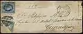 Bisected stamp (with regular full stamp) on an 1868 letter from Matanzas to Guanajay, La Habana Province, Cuba. The 20 céntimos stamp was cut in half to be used as a 10 céntimos de escudo stamp. The bisect is cancelled with a parilla handstamp and the other is a pen cancellation.
