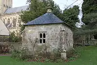 The Bishop's Palace lies within the Liberty of St Andrew, which encloses the cathedral, the Bishop's Palace, Vicar's Close and the residences and offices of the clergy who serve the cathedral. The palace is accessible from the adjacent market place through an archway known as The Bishop's Eye in the gatehouse to the walled precinct. The Bishop's Eye was built around 1450, by Bishop Beckington.[44] It is a three-storey building of Doulting ashlar stone, with a copper roof and has been designated as a Grade I listed building.[45] The Bishop's Eye forms one of a pair with the Penniless Porch which is the gateway into the Cathedral from the market place, which was built at the same time and in a similar style.[44] [46]