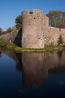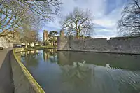 In the 14th century, Bishop Ralph of Shrewsbury continued the building. He had an uneasy relationship with the citizens of Wells, partly because of his imposition of taxes,[6] and surrounded his palace with 5 metres (16 ft)[7] crenellated walls,[8] a moat and a drawbridge.[9][10] The three-storey gatehouse, which dates from 1341, has a bridge over the moat.[11] The entrance was protected by a heavy gate, portcullis and drawbridge, operated by machinery above the entrance, and spouts through which defenders could pour scalding liquids onto any attacker. The drawbridge was still operational in 1831 when it was closed after word was received that the Palace of the Bishop of Bristol was subject to an arson attack during the Bristol riots. These took place after the House of Lords rejected the second Reform Bill. The proposal had aimed to get rid of some of the rotten boroughs and give Britain's fast growing industrial towns such as Bristol, Manchester, Birmingham, Bradford and Leeds greater representation in the House of Commons; however there was no rioting in Wells.[12] The water which filled the moat flowed from the springs in the grounds which had previously chosen its own course as a small stream separating the cathedral and the palace and causing marshy ground around the site. The moat acted as a reservoir, controlled by sluice gates, which powered watermills in the town.[13]